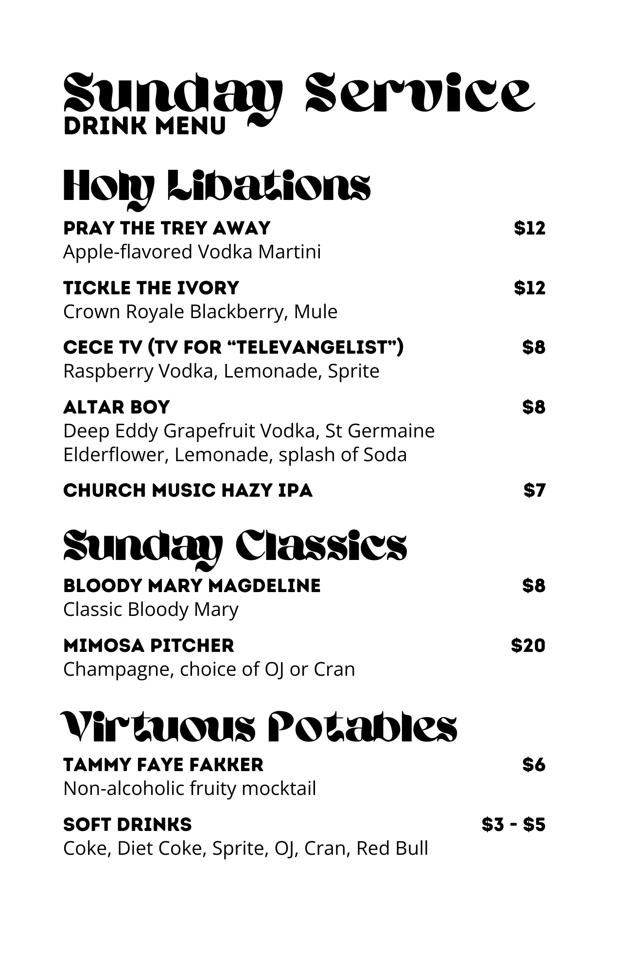 We don’t need another miracle when we have a fully stocked bar! Check out our Sunday Service drink menu for special selections crafted by the cast, including the “Pray The Trey Away” Appletini and the “Tickle the Ivory” Blackberry Mule. Or ask Stacy’s amazing staff to make your favorites! Just don’t order “surprise me,” lest you be smote with fire and brimstone in a glass!